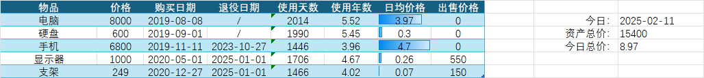 前一阵子看到了关于计算个人物品使用时间、日单价的小程序,这样的功能真是有趣。秉持「自己动手丰衣足食」的理念,设计了「资产日单价计算」的 Excel 工作簿来记录自己的个人资产: